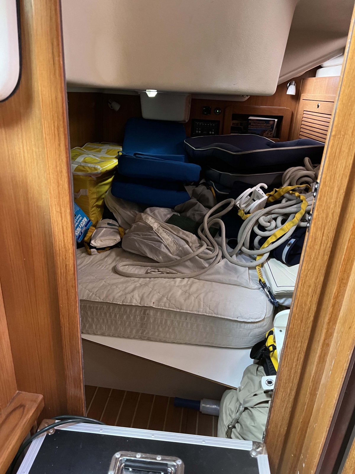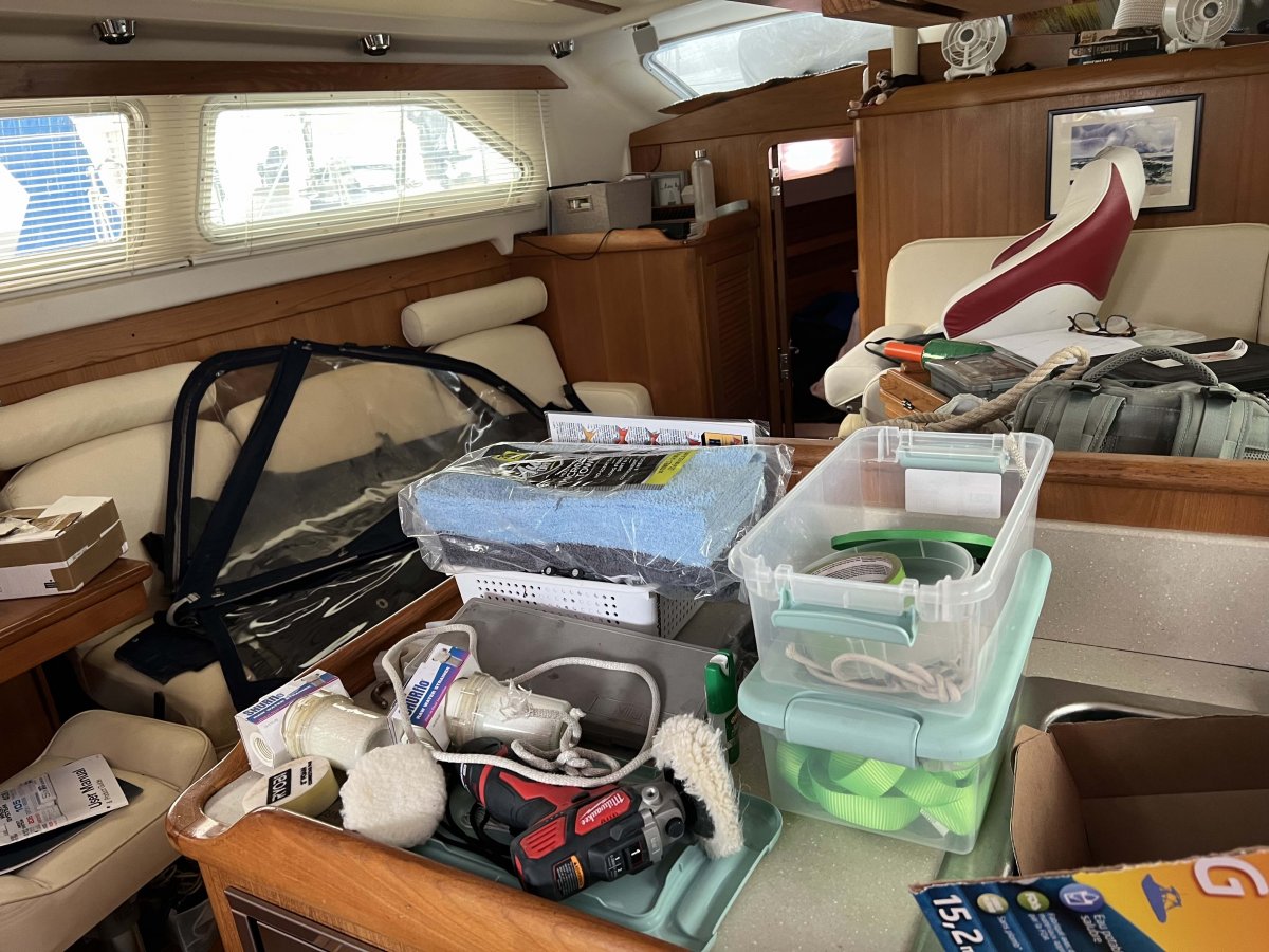 All the lines and halyards tucked away for hurricane season now have to be separated and put back up.