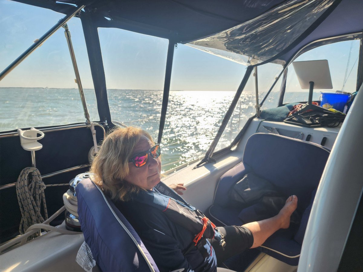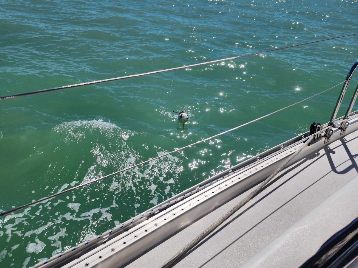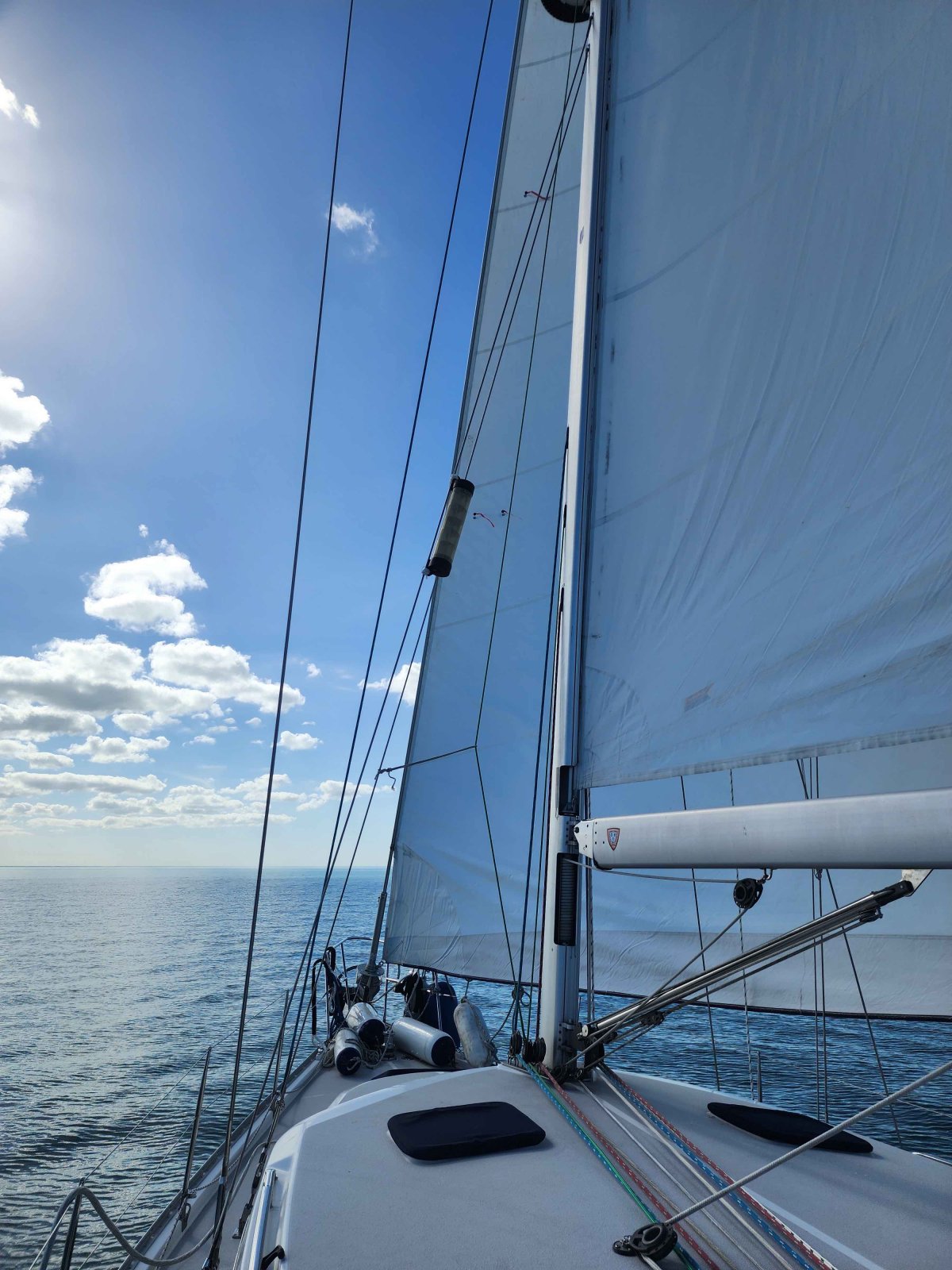 Once we were in 8-10 feet of water, we hoisted both sails and took off at 6.5 knots. All was good for 4 hours, listening to our books and podcasts until we spot crab pots. We were successfully dodging them until one appeared out of no where and we ran it over. Stop the engine, bring down the sails, reverse to try and dislodge it. We think we did but with so many crab pots around us was not sure. Continued slowly and was able to get back up to 6 knots. Kim did not feel evidence of anything but we will have to use our go pro to see if there is anything on our hull or prop.