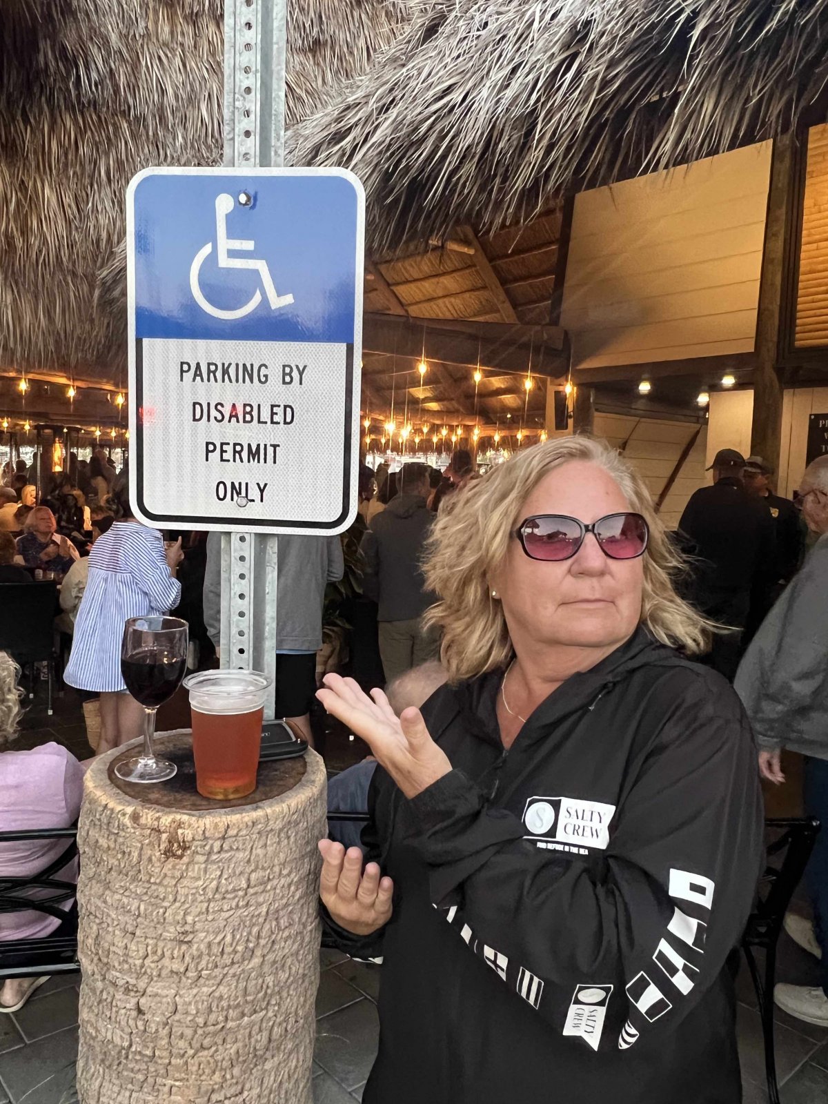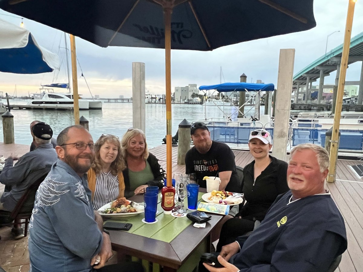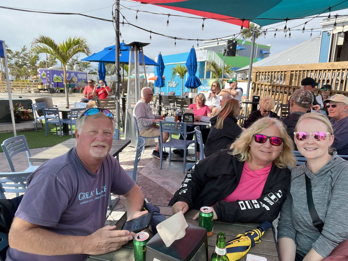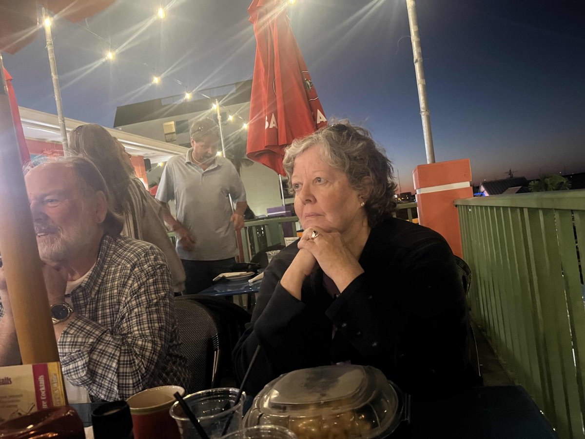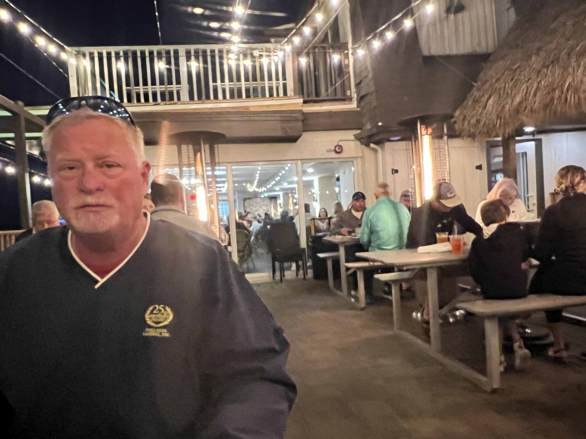 Dinner at Snook Inn. Notice behind Kim. The heaters way back. We were the only table with no heater because it was an exit area to dock. We tried to move but it was so busy. Froze!