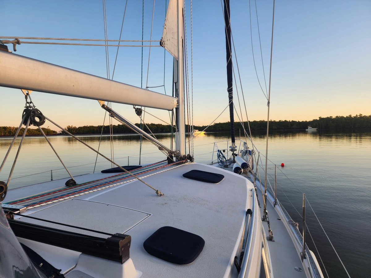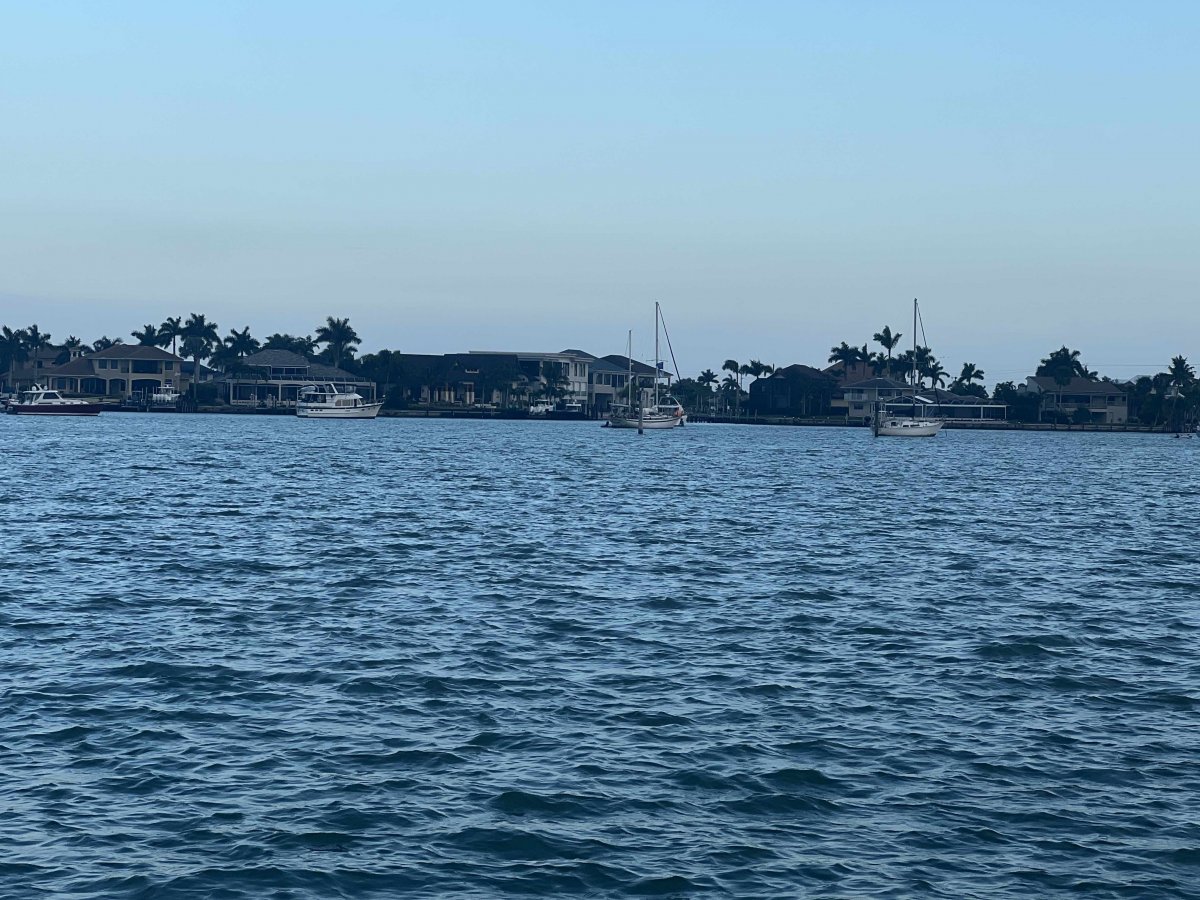 Left Ft Myers Beach, FL around 7:30 am. We were chased by the Key West Ferry out to the Gulf. Gulf was basically flat. The sun was out and we motored sailed to Marco Island. Set anchor in Factory Bay for the night.