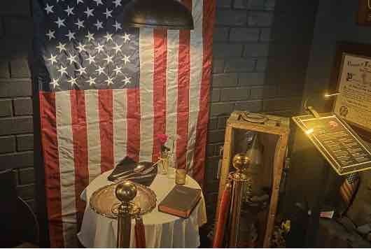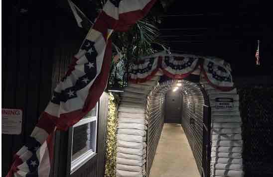 Tonight we went with Steve and Sherri from Sunshine Dreamer to a speakeasy. What a great time! They have a car so we rode in style. In back of the VFW hall is the Armory. To enter, you walk through a tunnel to the black box. Inside the box is a handheld radio. You must say the code word which changes daily. The door opens and you walk into this bar that has military memorabilia everywhere. You see the "Fallen Comrade Table", honoring POW/MIA service members.