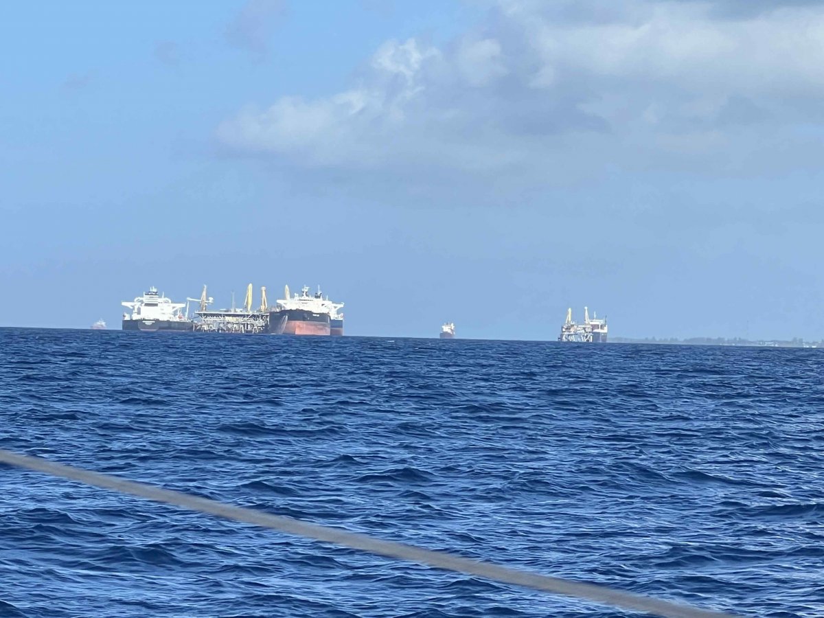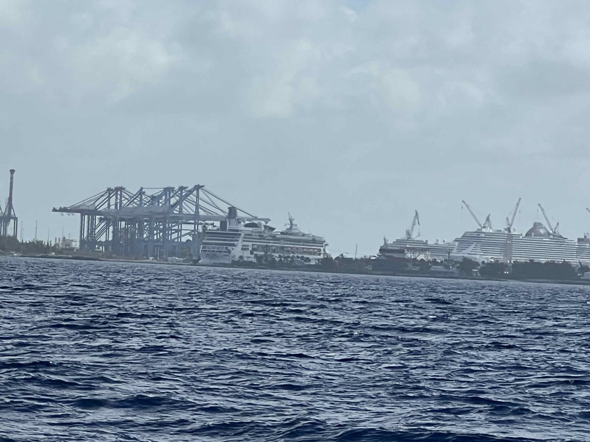 2). We traveled along the coast of the island for about 3 hours. Saw 10-15 freighters outside the Freeport Harbor. And there was about 3 cruise ships in port. Kim decided to throw up the Spinnaker (Go Eagles!) due to the light winds.