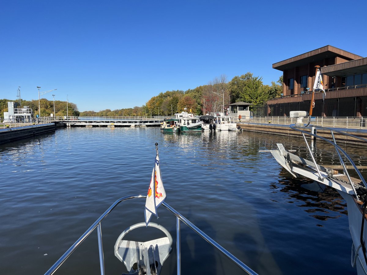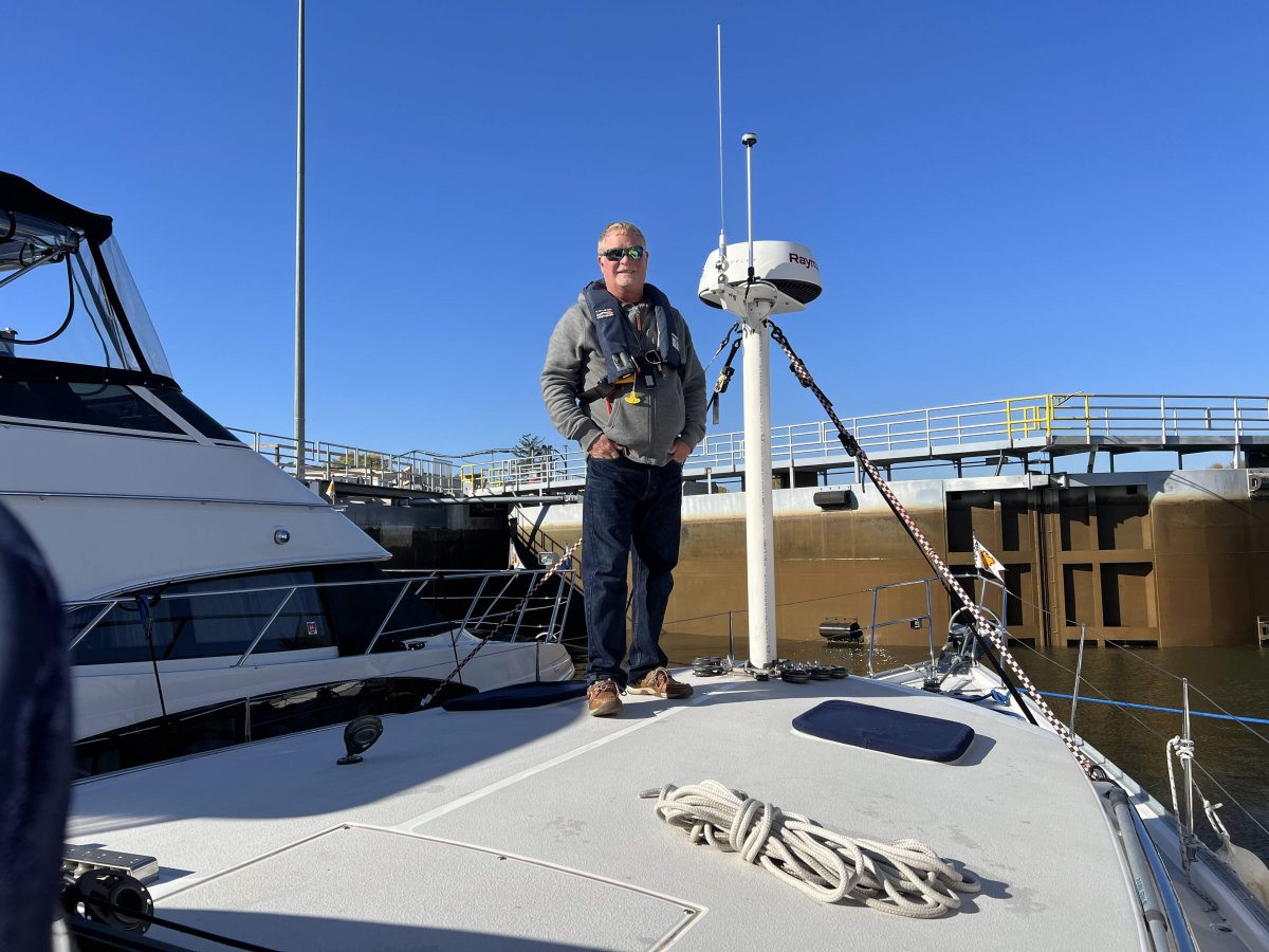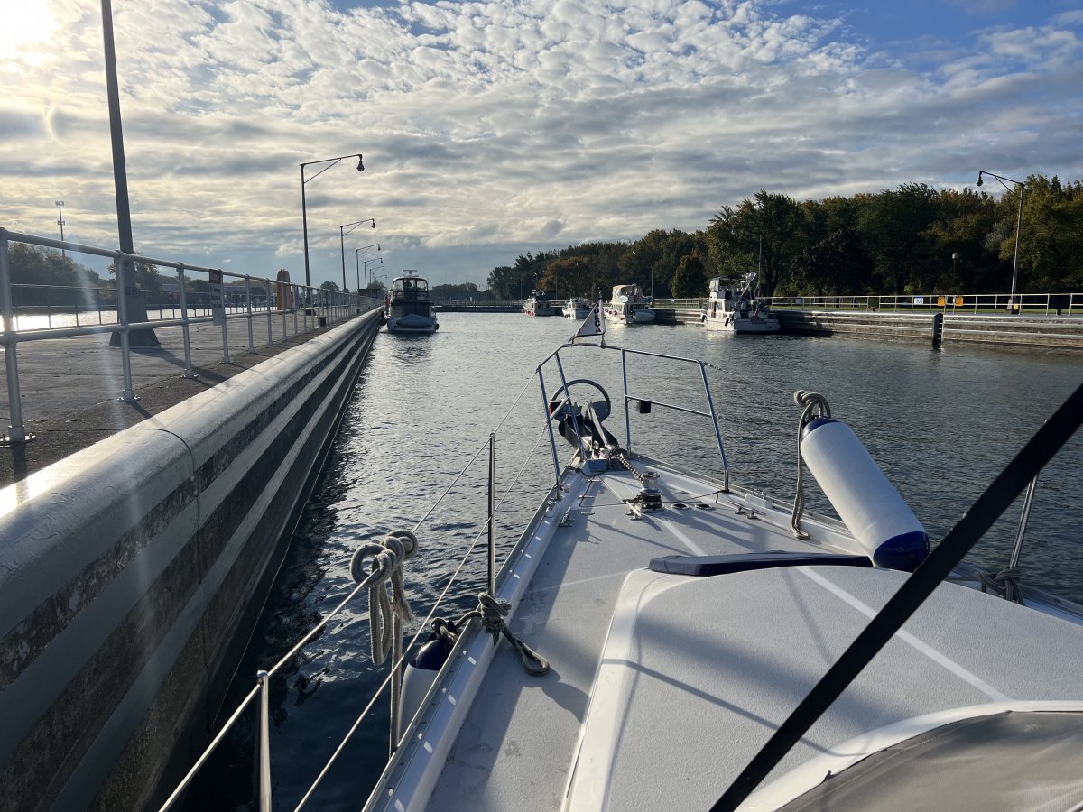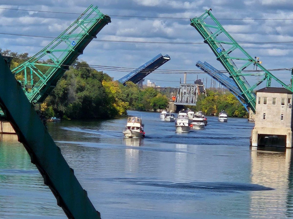 Flotilla 13-16 boats going under draw bridges. We are the only sailboat.